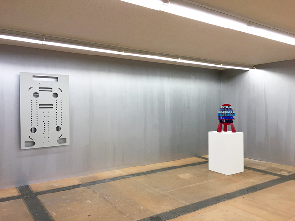Emanuele Marcuccio, “EM” (left), Ugo Nespolo, “Lavorare, lavorare, lavorare, preferisco il rumore del mare” (right)